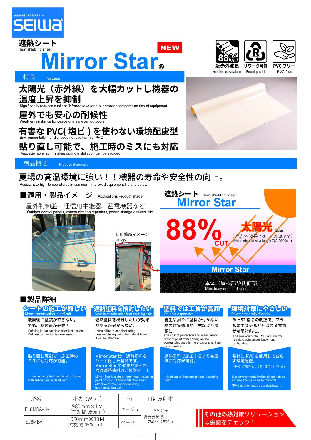 2026.3.2 太陽光(赤外線)を大幅カットし機器の温度上昇を抑制!遮熱シートMirror Star 星和電機株式会社 夏場の高温環境に強い!! 機器の寿命や安全性の向上。 屋外でも安心の耐候性。 有害なPVC(塩ビ)を使わない環境配慮型。 貼り直し可能で施工時のミスにも対応。 星和電機株式会社 遮熱シート Mirror Star 遮熱シート 前の記事へ |